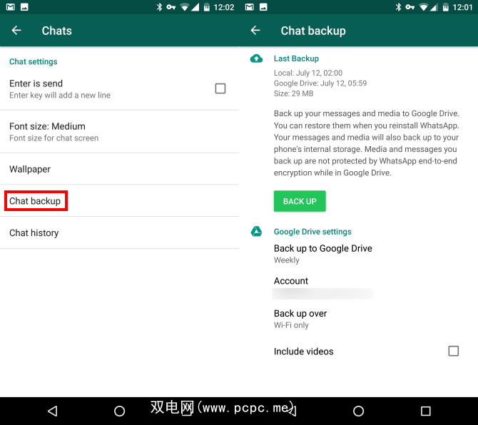 在Android上,转到设置>聊天>聊天备份。在此处查看设置,以确保您定期进行备份。您可以将自动备份到Google云端硬盘更改为每天,每周或每月。如果您也希望确保视频安全,请选中添加视频。您也可以点击备份按钮来立即运行备份。