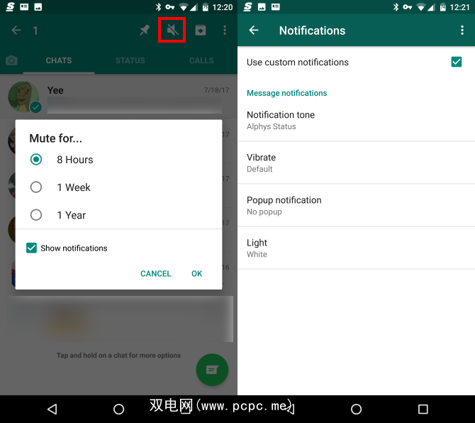如果要调整通知,请点击群组名称,然后使用菜单按钮选择组信息。选择自定义通知,然后选中使用自定义通知框。您可以调整声音,振动模式和弹出设置。对某些组使用不同的声音,即使您不看手机也可以识别它们。