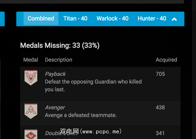 “命运追踪器"的“奖牌和武器"部分向您显示了您每次赢得了多少次