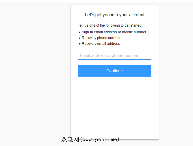 在此屏幕上,在标有电子邮件地址或电话号码的文本输入字段中输入您的电话号码,然后单击< strong>继续。