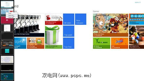 在某些时候,我的鼠标点击左上方,该内容就会出现-所有正在运行的应用的缩略图。至少,除了您正在使用的那个。右键单击显示不祥的关闭,以及向左或向右“ 捕捉到"的选项。然后,要关闭正在运行的应用程序,我切换到另一个正在运行的应用程序,打开任务切换器,然后右键单击以前运行的应用程序。 无论。