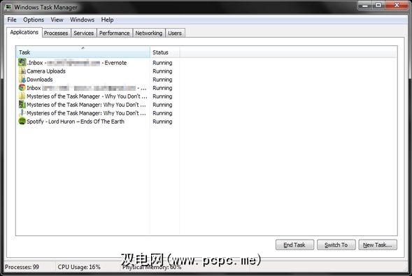 这可能是最常用的标签,因为它是一个默认打开。它提供了一种简单的方法来识别当前正在运行的所有应用程序。在这里,您可以创建一个新任务,切换到当前任务(尽管更有效的方法只是“开始"或“ Alt + Tab"按钮的组合),然后结束任务。您还可以简要了解计算机中正在发生的事情,正在运行的进程总数,CPU使用率百分比和物理内存百分比。