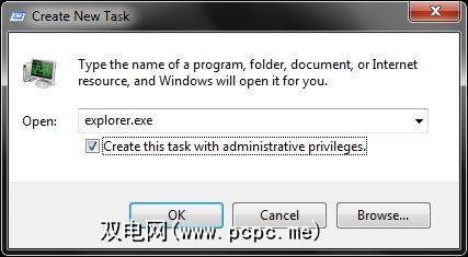 然后转到“文件">“新建任务",键入“ explorer.exe"并选中该框以创建具有管理员权限的任务。