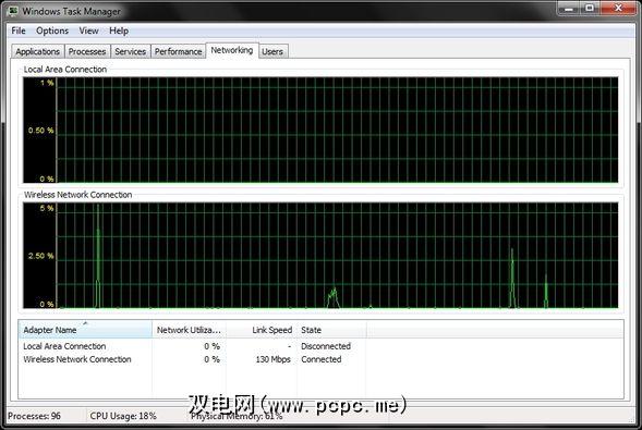 此标签实时显示活动网络连接的使用情况。有两个窗格:“本地连接"和“无线网络连接"。在检查您的网络以确保没有任何奇怪或可疑的活动时,这非常有用。