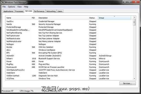 您可以转到“开始"菜单,单击“运行..."(或“开始+ R"),然后键入“服务" .msc" 或,您只需在任务管理器中单击此选项卡,如果您需要或忘记键入命令,它也具有用于访问“服务"窗口的按钮。
