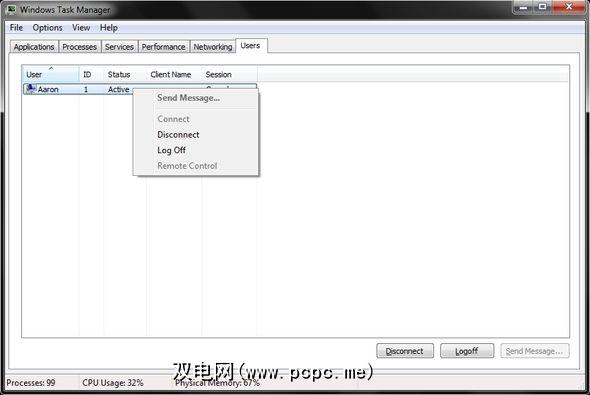 通过右键单击该用户,您可以注销或禁用其会话。禁用他们的会话会将他们正在处理的内容保存到内存中,同时仍然结束进程。如果一个或多个用户忘记注销,而留下他们正在处理的事情来减慢PC的速度,这将非常有用。