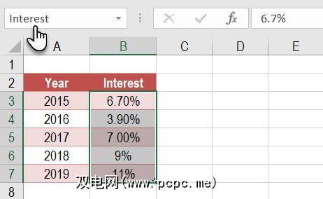在下面的屏幕中,我分配了 B3到B7 单元格的名称 Interest 。我选择这些单元格的范围,在“名称"框中键入“兴趣"一词,然后按Enter。工作簿中的所有范围名称都必须以字母,下划线或反斜杠开头。不允许使用空格。