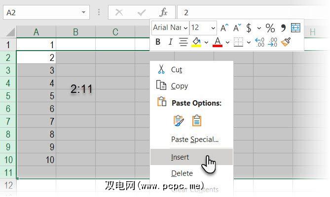 例如,如果要插入 10第2行中的所有行,然后在“名称"框中键入 2:11 ,然后按Enter。 Excel将从第2行开始选择接下来的十行开始(之所以为“十一",因为第二行也将计入接下来的十行)。