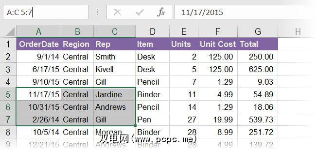 选择特定行和列在一起。 您甚至可以一起选择多个行和列。例如,键入A:C,5:7并按Enter键以获取以下选择。