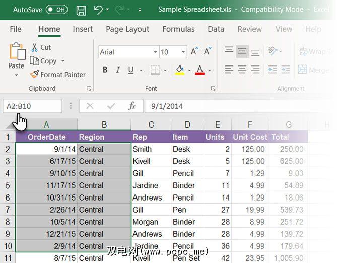 选择一个单元格块。在下面的屏幕截图中,我在“名称"框中键入了 A2:B10 ,然后按Enter。这样可以选择一个单元格块,而不必用鼠标在工作表中移动。