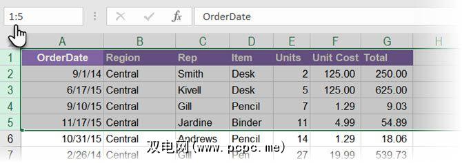 选择任意数量的行。是否要突出显示前五行?在名称框中键入 1:5 ,然后按Enter键以选择第1至5行。您必须选择两行或更多行。如果在“名称"框中键入单个数字(例如1)并按Enter,Excel将显示错误消息。