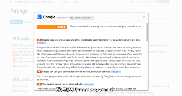 网站tosdr.org提供了热门站点的条款和条件的方便分类,而不是完整阅读。
