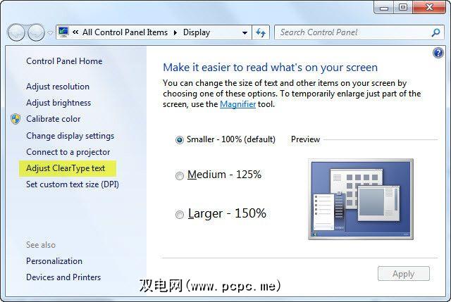 在“显示"窗口的左侧,您将看到一个链接,该链接为 Adjust ClearType Text 。单击。