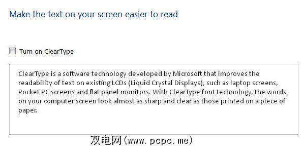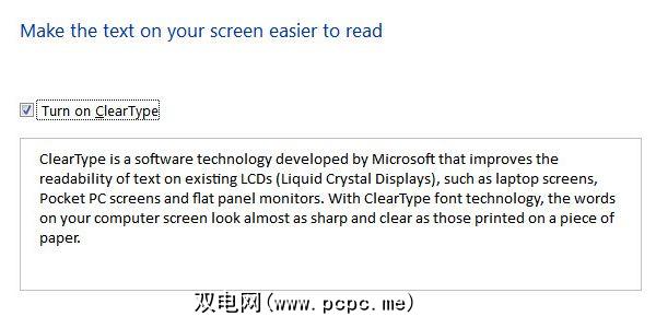 打开的下一个窗口使您能够通过选中或取消选中显示为打开ClearType 的框来打开或关闭ClearType文本。它可能已经打开,如果尚未打开,则单击该复选框。