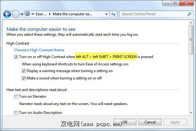 下一步。您将看到一些选择。请注意使用左Alt + 左移 + 打印屏幕的组合键打开或关闭高对比度的选项。