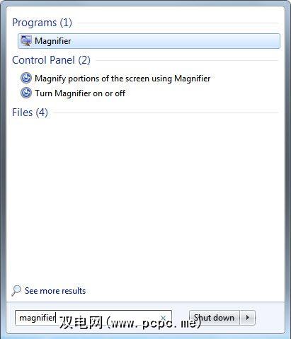 您可以通过 Display 窗口或单击 Start 按钮,然后在搜索字段中输入放大镜。单击快捷方式放大镜。