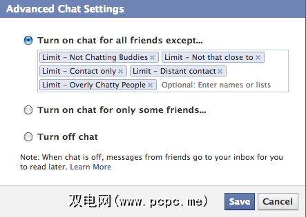您可能已经知道,也许还不知道可以过滤谁可以在Facebook聊天中在线看到您。有两种解决方法:使用黑名单或白名单。黑名单和白名单都可以由个人或朋友列表组成。因此,您可以选择与xyz列表中的人以外的任何人聊天。或者,您可以选择仅与列表abc上的人聊天。您的选择方式。然后,您要做的就是创建一个适合您需要的朋友列表。