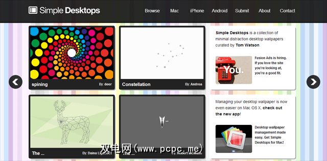 我最喜欢SimpleDesktops的地方是,由策划的墙纸中有明显的风格选择主人。所有者将其描述为一个无光晕,阴影和渐变的集合。结果,您得到的壁纸是扁平的,艺术的,但令人愉快的简约。如果您的口味适合您,那么您会喜欢这个网站的。