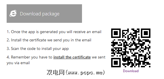 。单击“生成"后,将创建该应用程序(与Windows Phone 8和即将发布的Windows Phone 8.1兼容(如有必要)),并向您的Windows Phone发送一封电子邮件,其中包含您必须安装的附加安全证书。 Windows Phone App Studio中显示一个QR码,可以安装您的应用!
