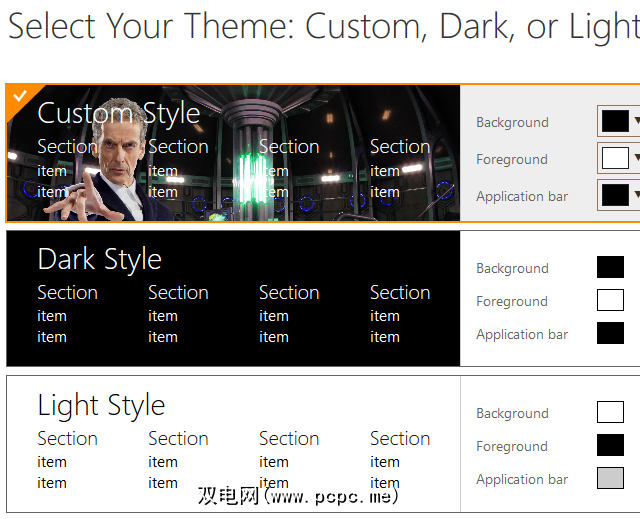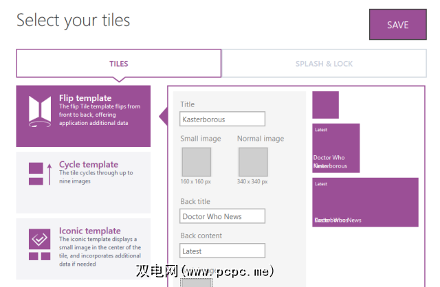 在继续执行Windows Phone App Studio时,请单击保存,这样就不会失去进度。途中,您可以为“开始"屏幕图块指定背景图像-可以将其设置为翻转或滚动-调整主题,设置应用程序图标甚至在实时应用更改时预览应用程序。