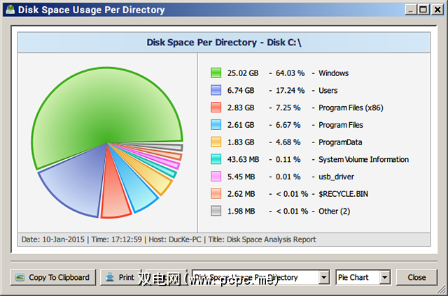 “磁盘精明"中的视觉表示很容易阅读。主窗口以类似于WinDirStat的导航布局列出所有扫描的目录,但是每个目录都可以表示为饼图。最重要的是,您可以查看占据最大空间的“前100个文件"和“前100个目录"。