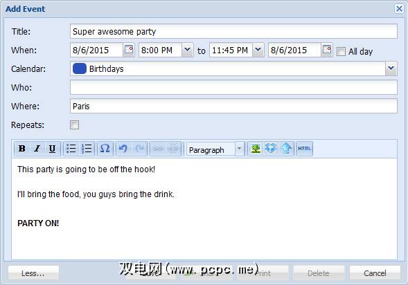 如果您的活动再次发生,那么您可以自行决定,并且Teamup有很多可用的选项这里。您还可以添加事件说明,并在编辑器中提供一些简单的格式,并使用HTML进行更精细的自定义。