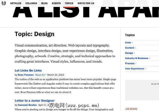 另一本在线杂志,A List Apart涵盖了您不仅需要为Web设计,还要编写服务器端代码,制定内容策略,管理项目所需了解的大多数主题。 ,并密切关注行业。 “设计"部分充满了设计师的有益思考,“编码"部分将帮助您微调您的HTML,CSS和JavaScript技能。