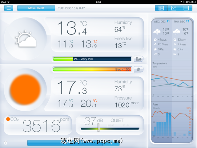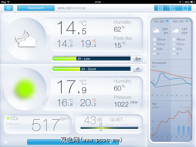 中间的两个小节概述了您的一般室内条件(从“很好"到“不好"),并提供了空气质量测量,显示污染物水平。还包括未来几天的当地天气预报。