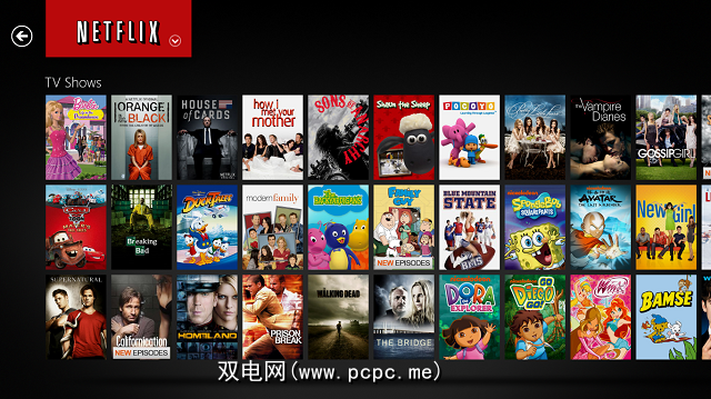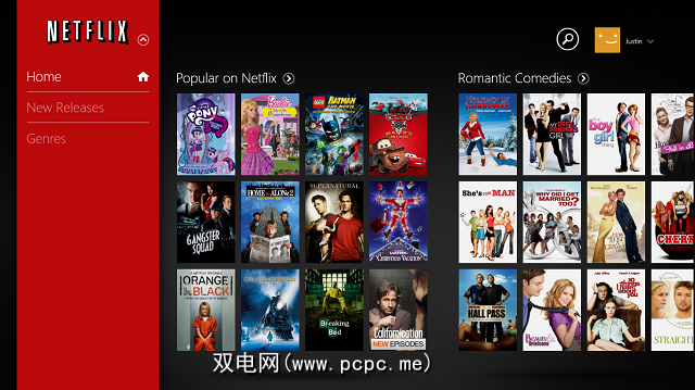 适用于Windows 8的Netflix App使用您期望从任何其他Windows 8应用程序获得的典型样式。当您打开它时,会看到由Netflix创建的一些自动生成的类别,它们会水平滚动,并且下面显示的红色条(允许访问不同类型的红色条)会随着滚动而向上滚动,而不会滚动。在右上角,您还可以看到Windows 8应用程序支持多个配置文件,使您可以在一个Netflix帐户上拥有多个用户。