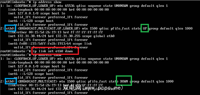 ip link set DEVICE downip link set DEVICE up类似于ifconfig DEVICE down或ifconfig DEVICE up,您可以将设备状态设置为up或down。只需将DEVICE替换为您要更改其状态的接口即可。