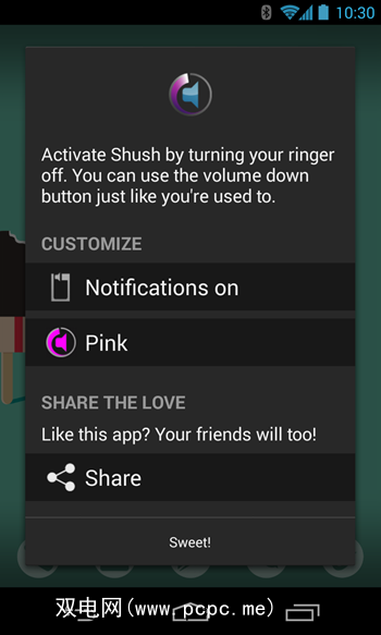 任何可以使用音量按钮使手机静音的人都可以使用Shush。老实说,它不需要更多的专业知识。首次安装时,只有两件事需要设置:配色方案和通知。