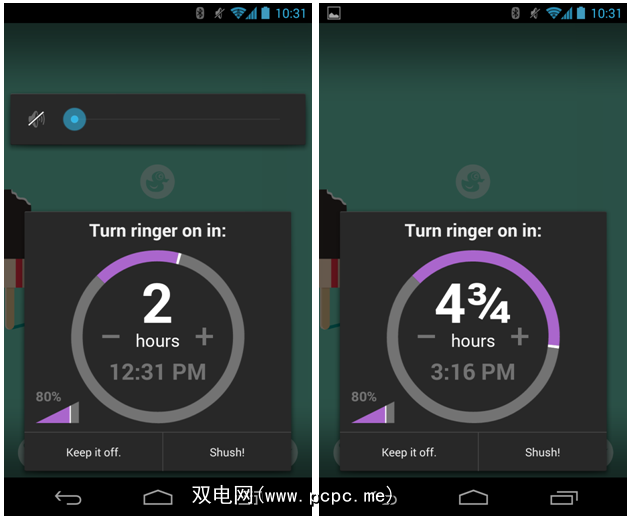 您可以设置Shush!从15分钟到12小时不等的计时器,以15分钟为增量。您可以在圆形Ovo风格上滑动手指,也可以使用加号和减号按钮。嘘!会告诉您铃声会在什么时间恢复播放,因此您甚至不必自己进行数学计算。