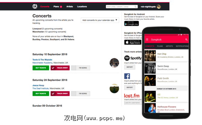 SongKick允许您导入您在Facebook,Spotify和Last.fm(但不是Deezer)上收听或关注的所有艺术家。与Spotify自己提供的建议相比,这可以提供更准确的建议。然后,您可以``跟踪''您喜欢的任何城市或艺术家,并在网站和应用程序中查看即将举行的音乐会的列表。然后,您可以比较各个商人的门票价格,并查看其他艺人的完整阵容。