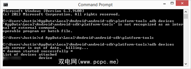 下面您可以查看采用常规ADB路线的常规流程。这是在命令提示符下完成的,涉及到更改 adb.exe 文件所在的目录,然后键入“ adb",然后键入您的命令。我使用“设备"来检查我的设备是否被识别。