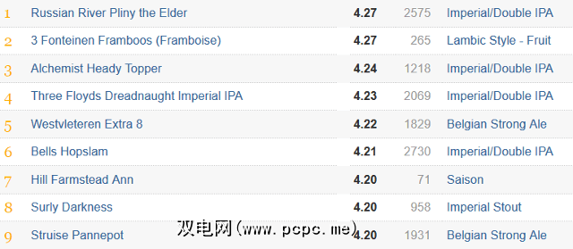 啤酒也有100分的得分,反映了其在所有啤酒中的百分位排名,以及风格得分,反映了其在所有啤酒中的排名