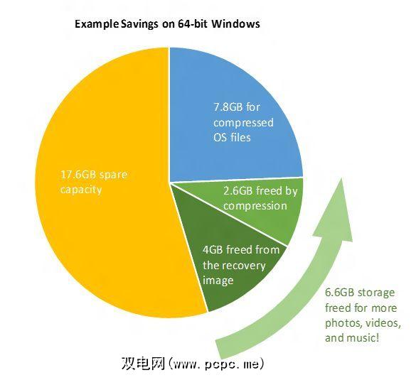 作为跨平台操作系统,Windows 10面临着支持多种设备的挑战,包括平板电脑和手机。在存储空间有限的设备上,每GB都很重要。在具有足够RAM和CPU性能的系统上,Windows 10将压缩系统文件并节省1.5(32位)至2.6(64位)GB的存储空间。此外,Windows 10设备不需要恢复分区,从而将操作系统占用空间减少了几GB。而是将恢复资源集成在系统本身中。这些措施合起来最多可以节省14GB。