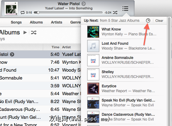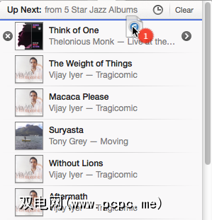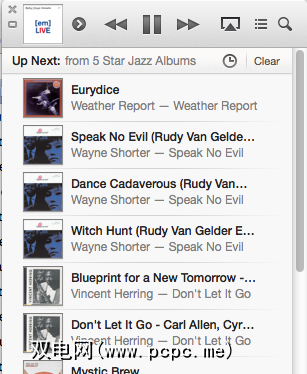 iTunes 11中另一个方便的新功能是 Up Next 。当您在播放列表或专辑中播放歌曲时,单击播放器控件旁边的 Up Next 按钮将向您显示接下来出现的歌曲或其他iTunes项目。还有一个小时钟图标,显示您已播放的最新歌曲,播客或电视节目等的列表。似乎该列表一直在增长,直到您将其清除。
