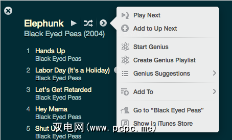 还有一个弹出菜单,您可以通过在展开的相册视图中单击箭头按钮来访问。该菜单包括以下功能:使用选定的歌曲创建一个天才播放列表,将歌曲添加到“ 播放下一个"列表(稍后会详细介绍),在iTunes Store中定位该歌曲,或链接到在 Artist 视图中选择歌曲。