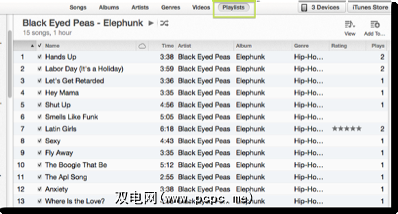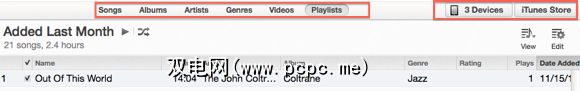如果您创建了很多播放列表在iTunes中,您可能需要在该视图中浏览和浏览资料库。选择“播放列表"视图将显示其当前选定播放列表的内容,但还将显示所有播放列表的侧边栏列表,类似于iTunes 10中的设置。但是此侧边栏将不包括您的iOS设备或指向以下内容的链接iTunes Store –仅是您的播放列表。