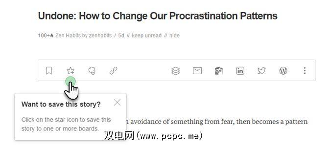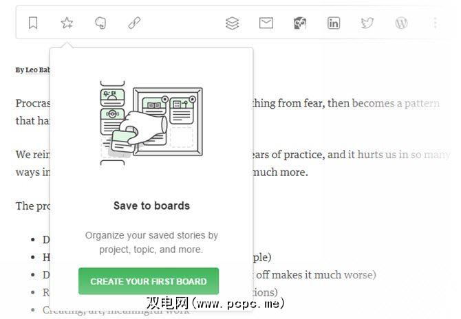 您应该已经在Feed中的文章顶部找到了工具栏。要将文章保存到板上时,只需单击星标。创建您的第一个董事会。给它起一个漂亮的描述性名称,它将成为您想要保存的所有文章的主页,并在以后返回。您也可以将文章保存到多个开发板上。