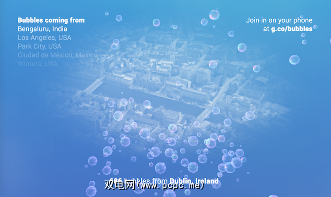 这就是全部呈现为通过水泡查看Google地图的超现实视图。气泡不断吹,人们不断加入,地图不断带您前往其他城市。