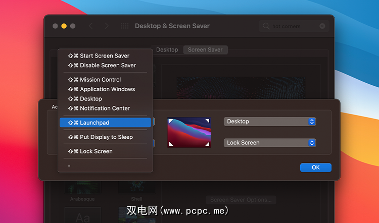 要设置热角,请前往设置 > 桌面和屏幕保护程序 > 屏幕保护程序选项卡 > 热角。在这里,您可以为各个角落设置不同的功能,例如锁定屏幕、打开 Launchpad、显示桌面等等。