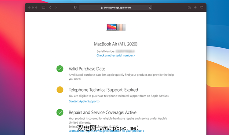 要激活设备的保修,请前往checkcoverage.apple.com并输入Mac 的序列号。然后,单击Continue,一个页面将显示您的 Mac 的保修是否已注册。