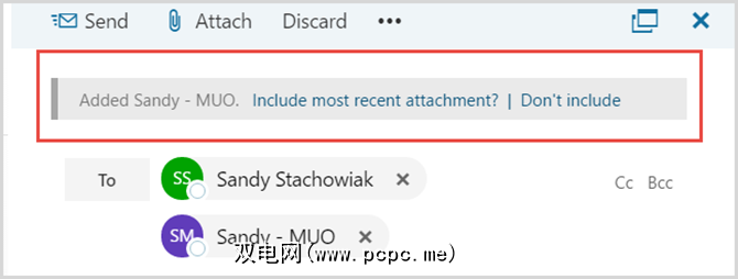对于包含附件的邮件,您现在,当您向电子邮件流中添加新收件人时,将看到该附件的提醒。系统将提示您添加最新的附件或不包含任何附件。这是一项方便的功能,可避免依赖于内存来包含重要的附件。