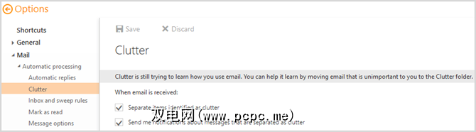 然后可以启用或禁用用于分隔的选项并显示为杂波,并接收有关那些标识为杂波的消息的通知。激活后,杂波将显示在您的文件夹列表中。