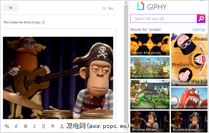 GIPHY 是一个有趣的加载项,可让您在消息中添加一些麻烦。无需离开Outlook.com,您就可以在特殊情况下添加动画GIF,以使接收者发笑,或只是出于愚蠢的事情。