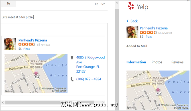 Yelp 是一种流行的搜索工具附近的位置。并且,包括您在电子邮件中找到的内容也可以帮助您制定计划。无论是餐馆,商店,酒店还是夜总会,您都可以将详细信息直接弹出到Outlook.com电子邮件中并发送给朋友。