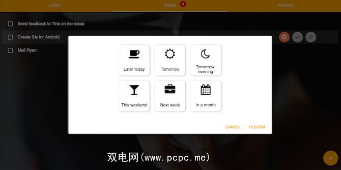 根据需要创建任务列表。但是看到旁边的小时钟图标了吗?单击或点击它以启动快速的“以后延后使用"菜单。在另一次点击中,您可以将该任务推迟以供以后使用,并为其设置自动提醒。默认选项是今天晚些时候,明天,明天晚上,这个周末,下周和一个月。您还可以为以后设置自定义提醒。