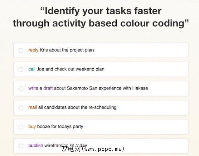 “待办事项"标签具有一项聪明的功能,可将其置于其他以生产力为中心的新标签扩展名之上。它会自动标记不同颜色的常见活动。每个标签都是一个动词,遵循生产率原则,即应该以动词开头列出每个任务。目前,“ ToDo选项卡"自动为以下标签上色:发送,邮件,回复,发布,呼叫,会议,讨论,集思广益,购买,获取,预订,订购,工作,个人,写作,草稿和发布。