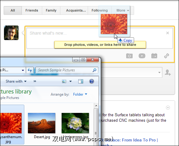Google+可以轻松上传和共享照片以及视频存储在您的计算机上。只需将它们从计算机拖放到浏览器中的新信箱即可。它们将被上传,您可以在帖子中轻松共享它们。